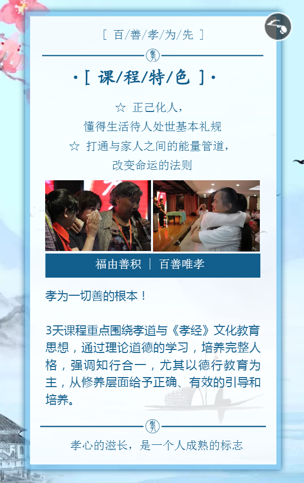 树欲静而风不止,子欲养而亲不待,大型公益传承《孝经》课程兹定于2020年8月21日——23日举办,特邀请成都众赏国学馆创始人李浩源先生及传统文化践行者,国学传承人悦然老师亲临授课,本场活动公益践行,欢迎各企事业单位及团队联合主办,弘扬儒商精神,传承圣贤文化,学习圣贤文化,堂堂正正做人!